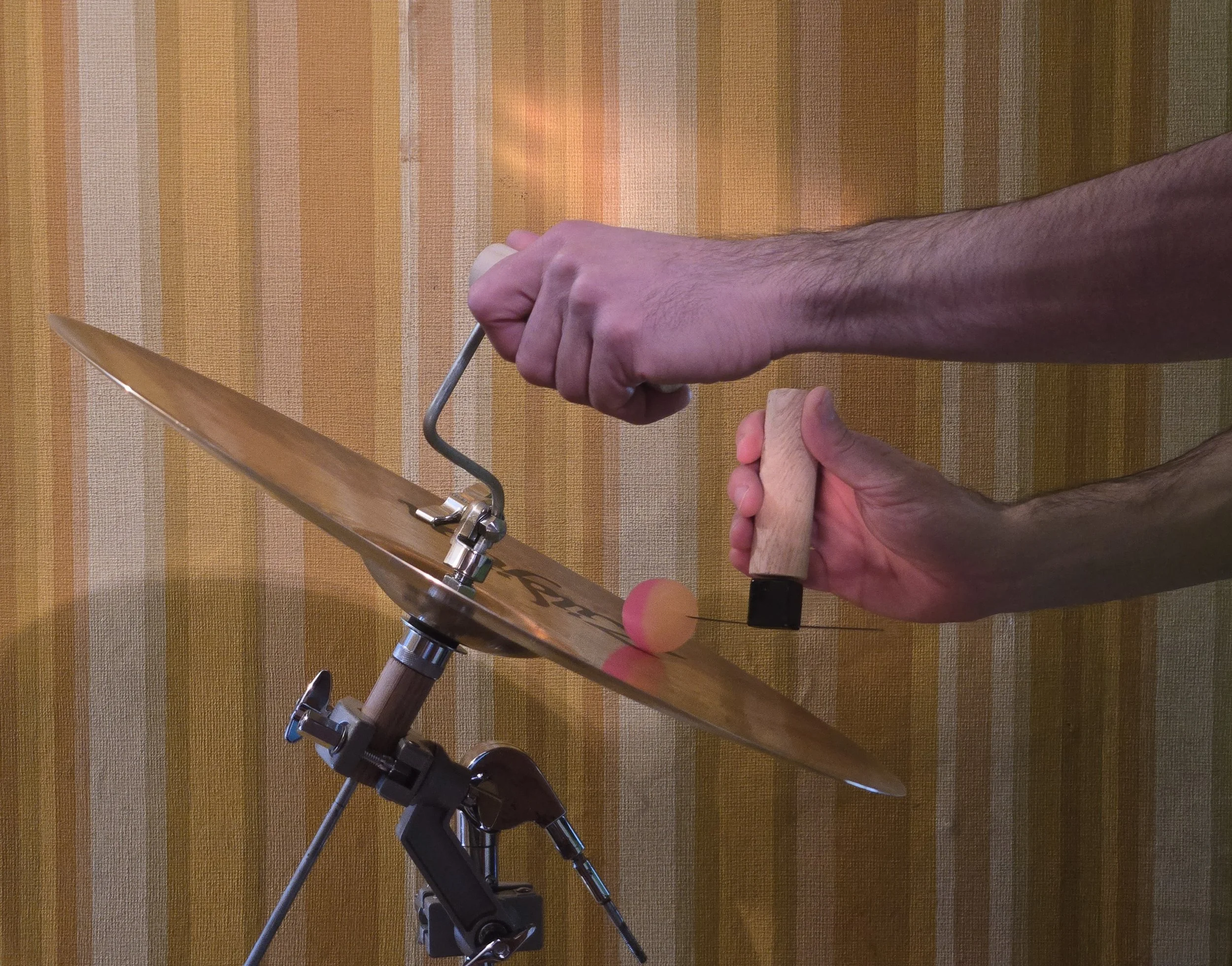 Cymbaloniq enables players to create sustained sounds from any crash or ride cymbal. By rotating the cymbal and engaging it with an adjustable friction mallet called The Slip Stick, resonance builds into an intoxicating soundscape. Varying parameters such as the size, texture pressure and location of the Slip Stick’s ball brings out different notes and sounds.